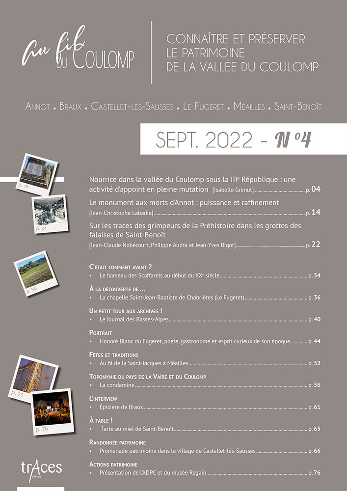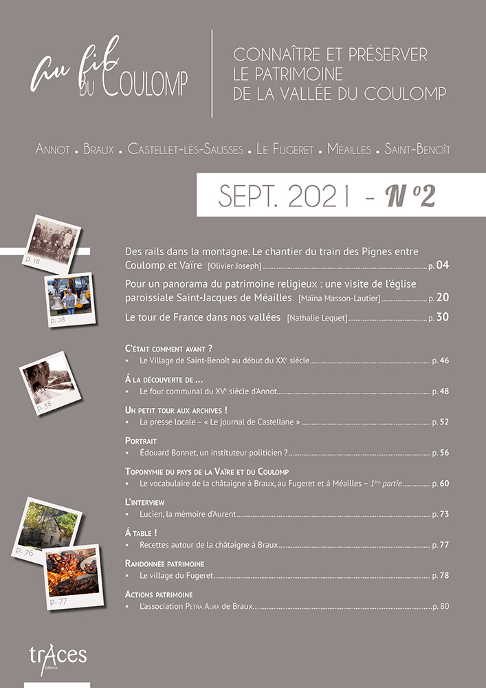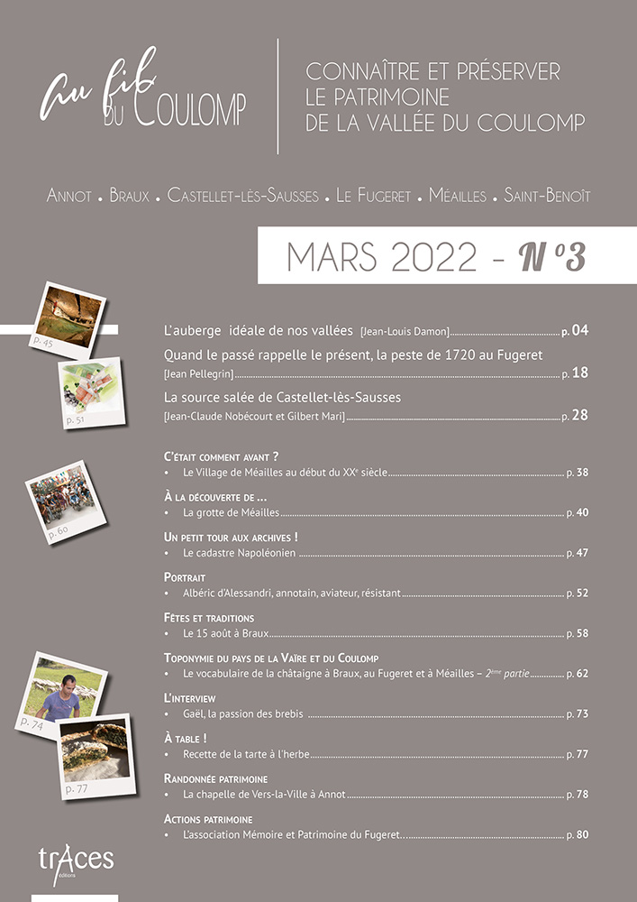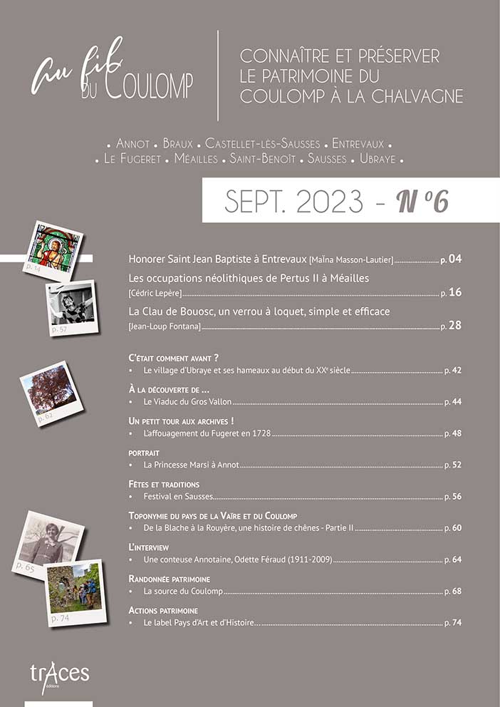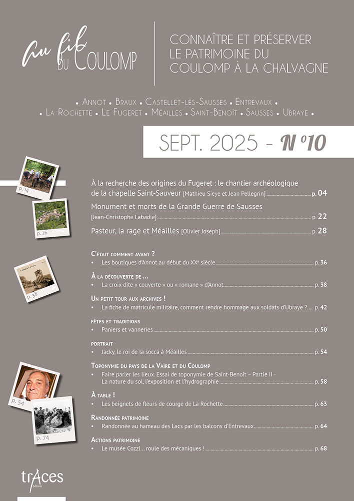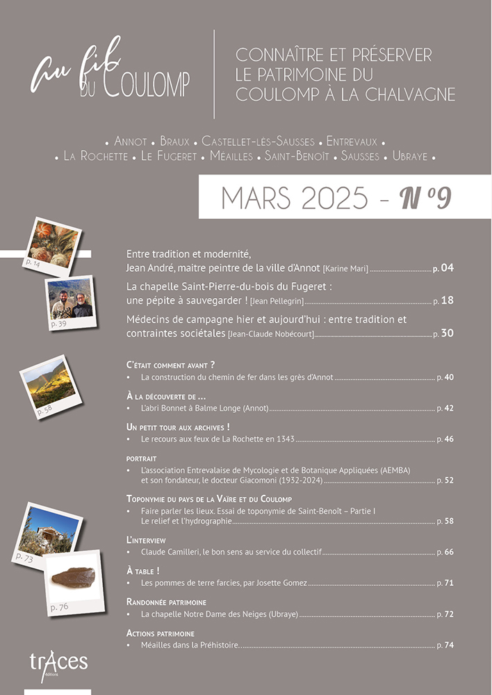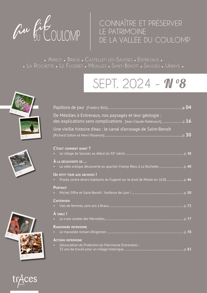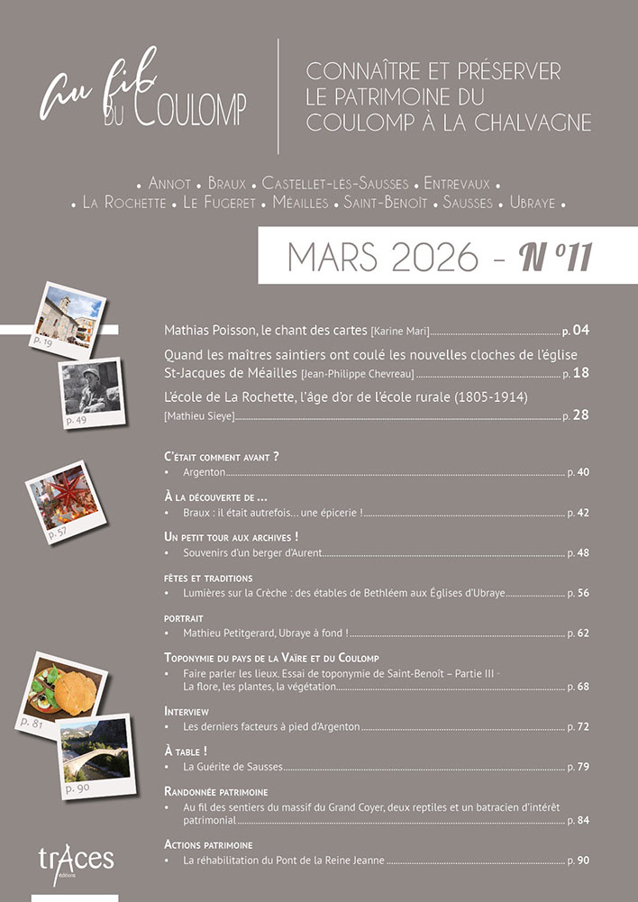 Cette richesse, de nombreuses personnes en détiennent le savoir, agissent pour son maintien ; mais beaucoup regrettaient, souffraient même, qu’il n’existât pas un support à cette connaissance, un média pour la documenter et la faire connaître. De cette demande diffuse sur le territoire est née, à son cœur même, à Saint-Benoît, la revue Au fil du Coulomp. Celle-ci n’a qu’un objet, qu’un but : donner la parole aux érudits et aux protecteurs du patrimoine de nos vallées, la porter au plus grand nombre par le texte et par l’exposé oral, en respectant son authenticité et dans un esprit non élitiste de médiation scientifique. Du Var à la Chalvagne en passant par le Coulomp, la Vaïre et la Galange, avec notre revue, partez à la découverte des richesses de nos vallées préservées…