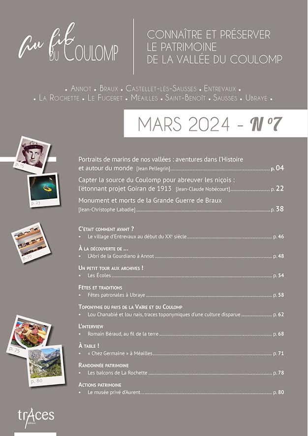 Dans chaque numéro, deux fois par an, Au fil du Coulomp vous propose des articles inédits sur les sites naturels remarquables, les monuments, l'histoire et les traditions d'un territoire qui recèle quantité de richesses et d'héritages. Vous y retrouverez également nos rubriques régulières (randonnées patrimoine, toponymie, documents d'archives, cuisine de terroir, interviews, portraits, etc.).